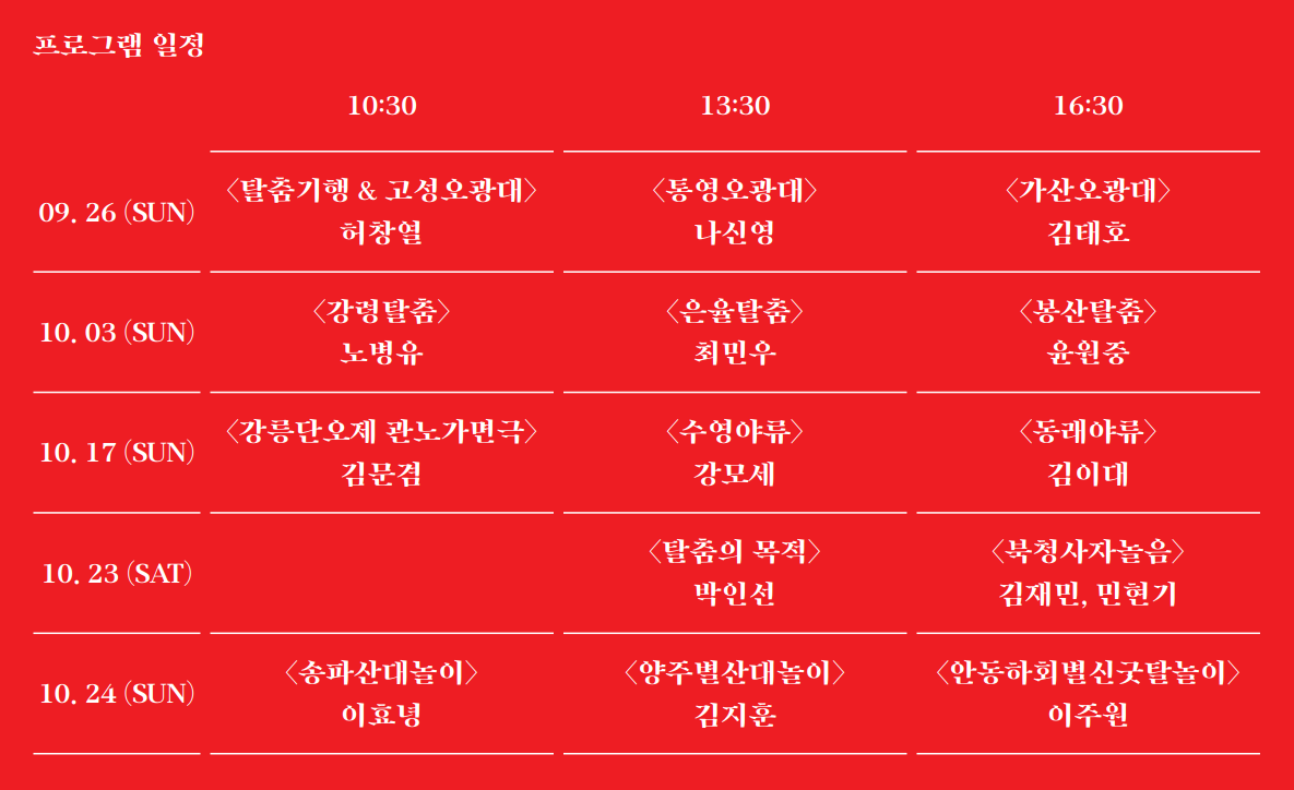 13개 전국 탈춤의 다양한 요소들을 살펴보는 시간으로 젊은 탈꾼들의 생생한 이야기를 통해 다양한 지역의 탈춤을 비교해보며 각 지역, 캐릭터를 돌아봅니다.