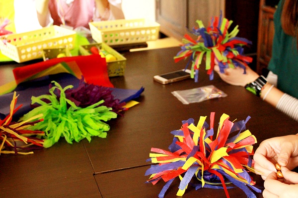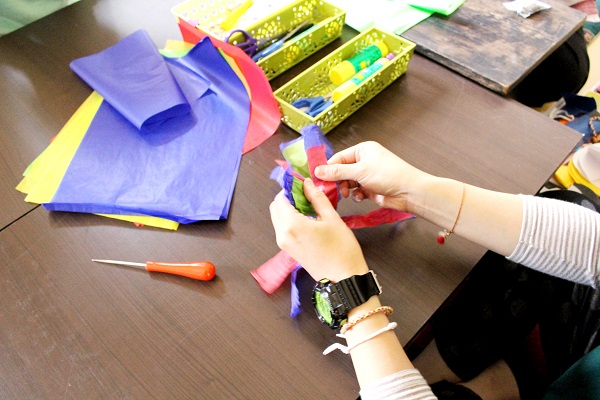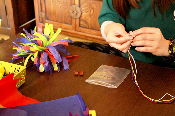 '제기 만들기'는 색색깔 습자지를 잘라 엮어 전통놀이 소품을 만드는 체험입니다.