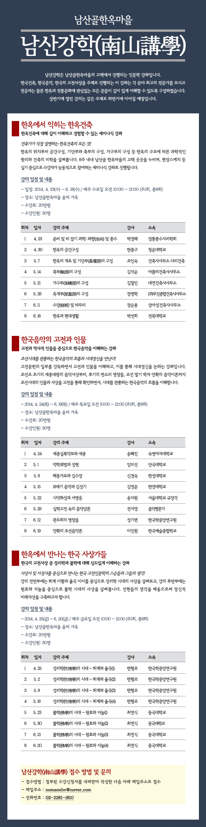 주소 (04626) 서울시 중구 퇴계로34길 28 이메일 namsangol@hanokmaeul.co.kr 전통가옥 운영사무실 02-6358-5533