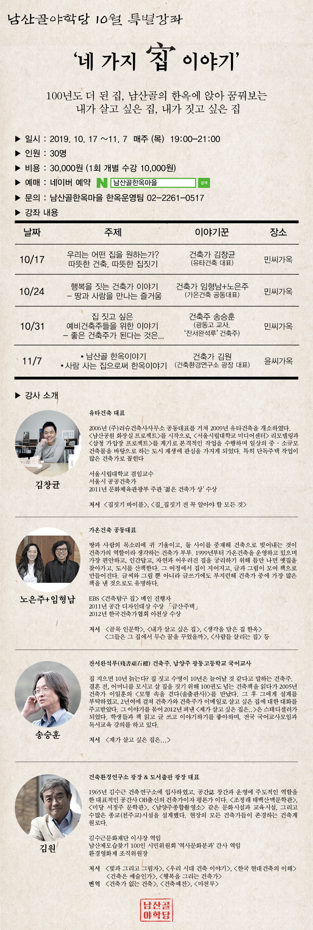 주소 (04626) 서울시 중구 퇴계로34길 28 이메일 namsangol@hanokmaeul.co.kr 전통가옥 운영사무실 02-6358-5533