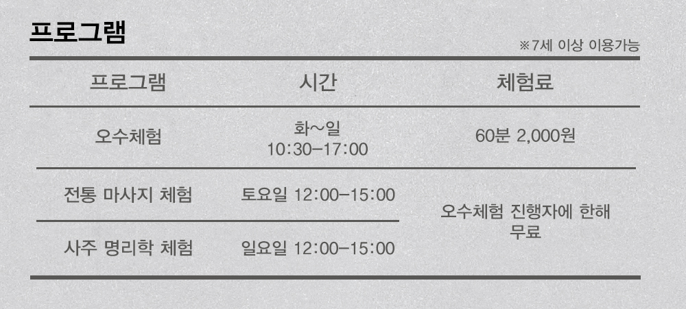 주말 무료 체험 (마사지/사주팔자) 의 경우 당일 매표자에 한해 선착순 접수
