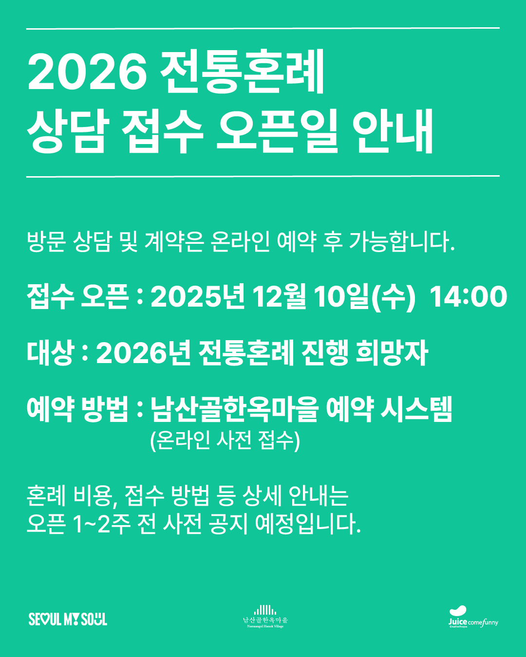 혼례 비용, 접수 방법 등 상세 안내는 오픈 1~2주 전 사전 공지 예정입니다.